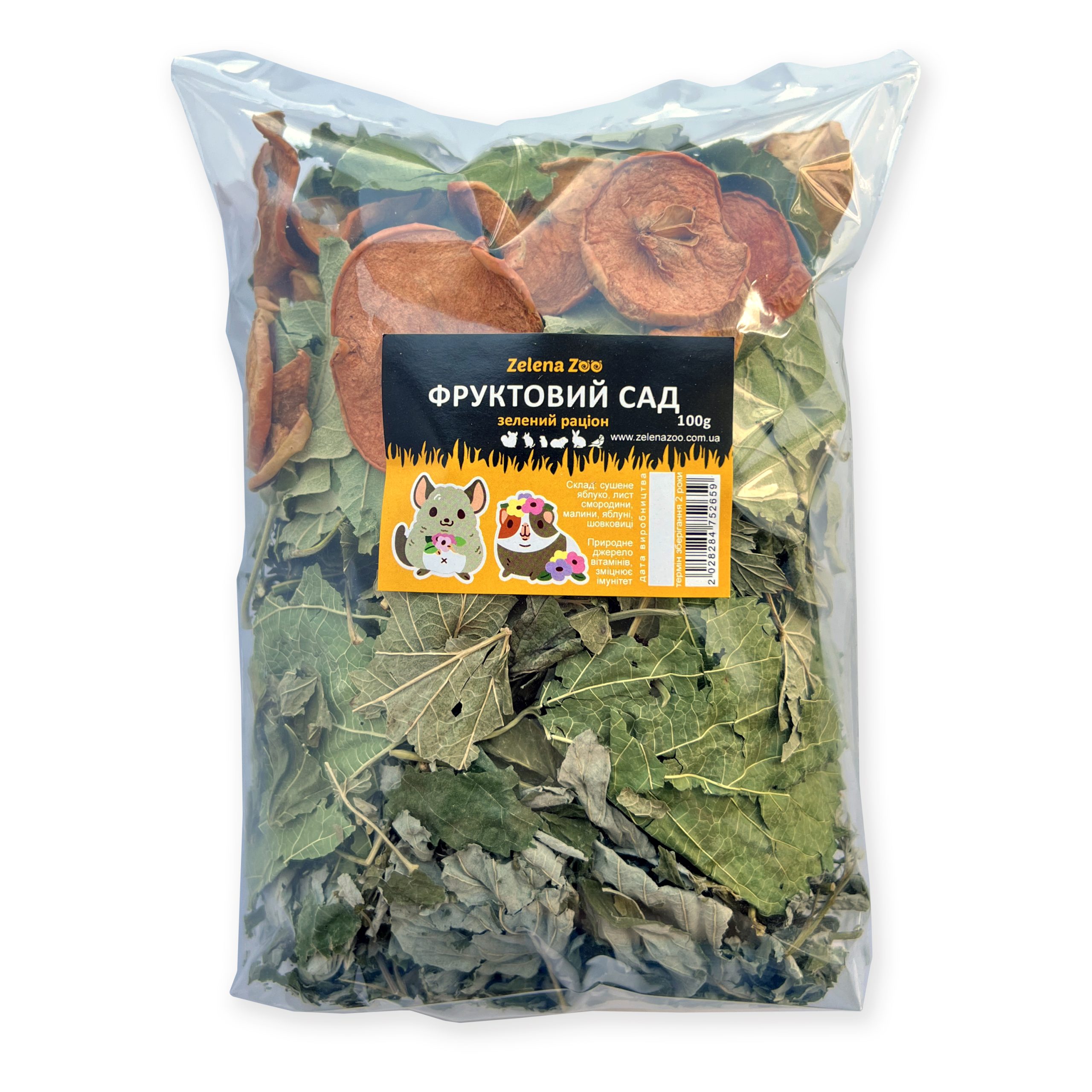 Фруктовий Сад ЗЕЛЕНИЙ РАЦІОН 100 г Zelena Zoo – здорова дієта, багата на клітковину щодня. Зелений раціон є важливою частиною меню. Природні інгредієнти для правильного збалансованого та здорового харчування гризунів та папуг.