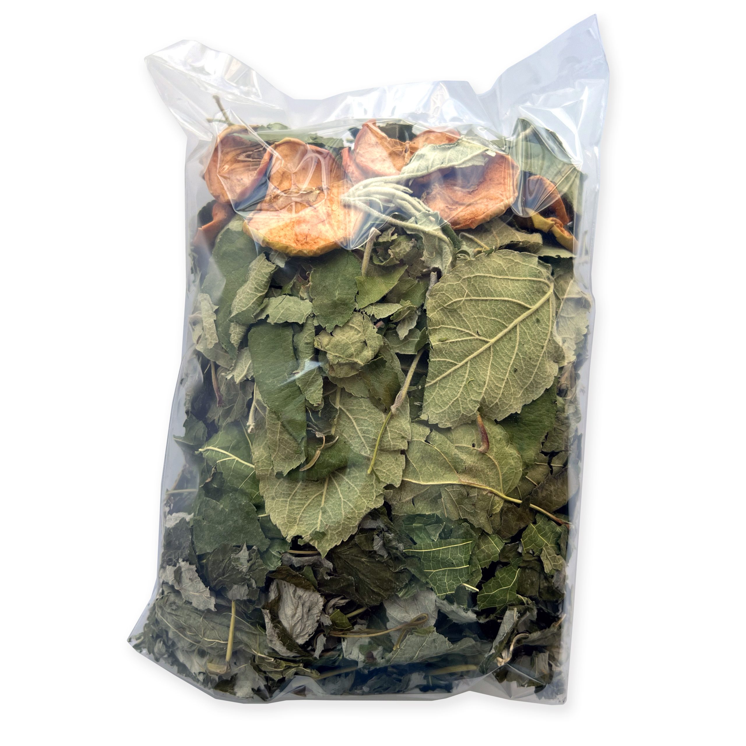 Також сушені яблучка та листя можуть бути корисним доповненням до раціону багатьох видів папуг, але їх слід вводити в невеликих кількостях. Сушене листя фруктових дерев містить вітаміни та мінерали, які можуть підтримувати загальне здоров’я птахів, зокрема вітамін С, К, і залізо. Вони також мають антиоксидантні властивості, які можуть бути корисними для здоров’я папуг.