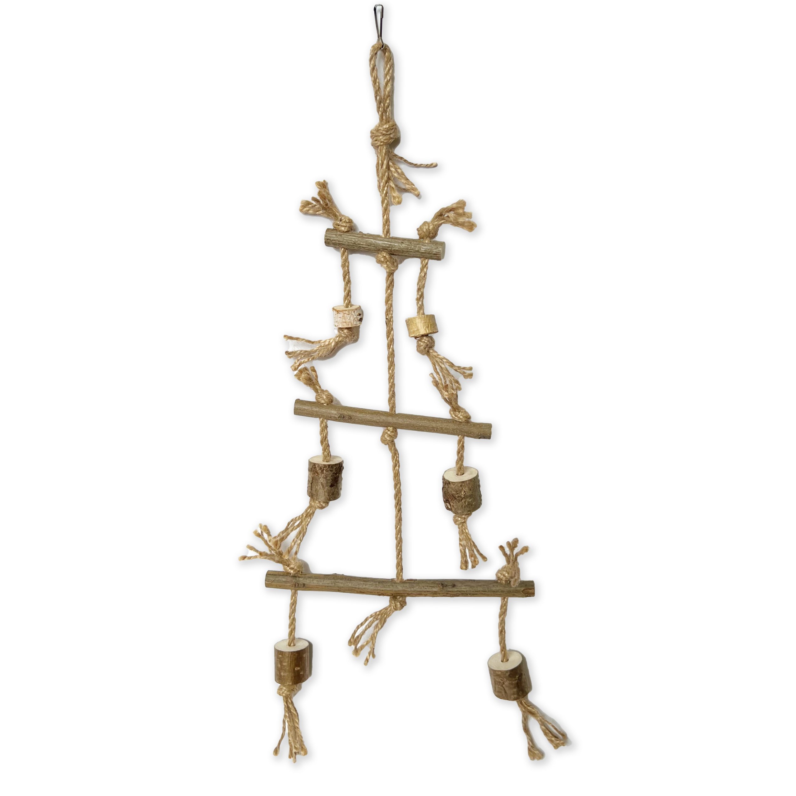 - Матеріал: Ця гойдалка виготовлена з натурального джутового канату, екологічно чистого матеріалу, що забезпечує безпечне і тривале використання. Міцні дерев’яні перекладини стійкі до гризіння.