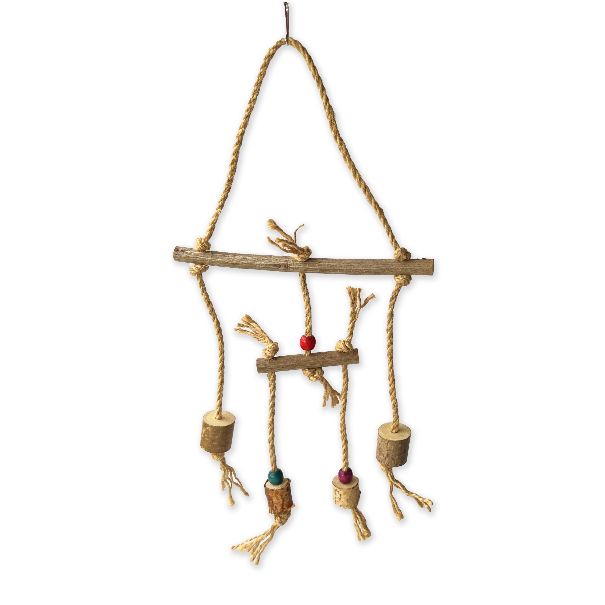 - Матеріал: Ця гойдалка виготовлена з натурального джутового канату, екологічно чистого матеріалу, що забезпечує безпечне і тривале використання. Міцні дерев’яні перекладини стійкі до гризіння.