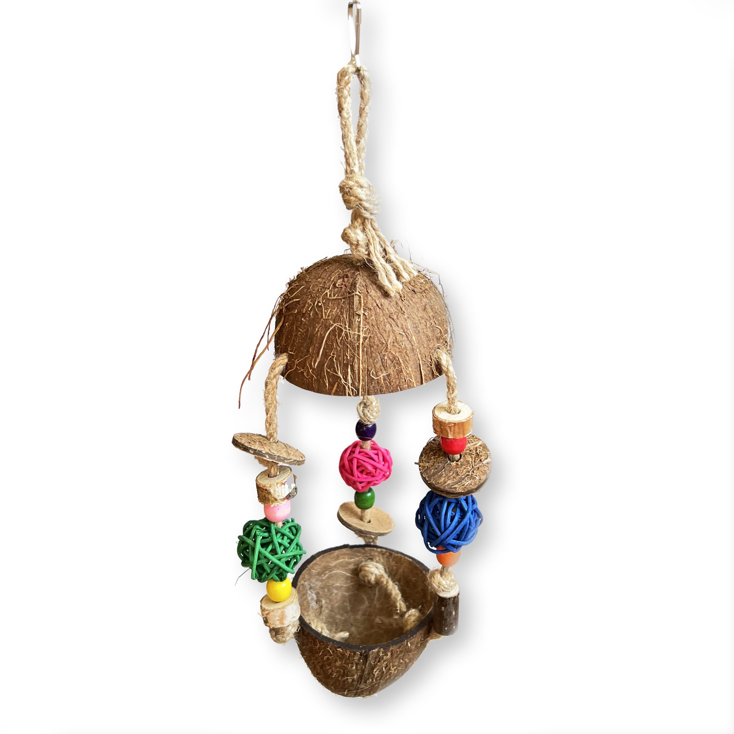 Цю іграшку можна назвати погризушкою, так як всі її складові (крім металевого гачка для кріплення до клітки) повністю натуральні і можна згризти! Ця Іграшка Годівничка із кокоса вбереже ваше майно від псування, і допоможе завжди бути у чудовій фізичній формі.
