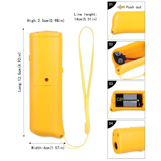 Щоб використовувати Ультразвуковий відлякувач собак з ліхтариком Zelena Zoo, достатньо вставити батарейку типу крона і запам’ятати можливості: